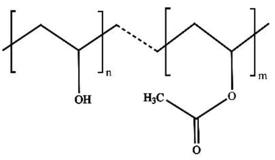 PVA resin is obtained by the hydrolysis of polyvinyl acetate (PVAc) [25]. In the process of alcoholysis of PVAc, part of the alcoholysis generates polyvinyl alcohol [26], so the physical and chemical properties depend on the degree of polymerization and alcoholysis, especially the degree of alcoholysis [27]. Figure 2 is a Schematic diagram of PVA and PVAc coexistence. Through the control of the preparation process, it can be made of different degrees of alcohol dissolution of different degrees of polymerization of polyvinyl alcohol resin (commonly used grades are PVA-1788, PVA-1799, PVA-2488, etc.—the first two digits are the degree of polymerization, the last two are the degree of alcohol dissolution) [28]. Through the solution of the cast film method [29], wet extrusion blowing film method [30], dry extrusion film method, and other film-forming processes to get different properties of PVA film. PVA films are generally divided into two types: water-soluble films made from polyvinyl alcohol resins with an alcohol solubility of about 88%; and insoluble films made from polyvinyl alcohol resins with an alcohol solubility of 98% and above. PVA film has adjustable water solubility, whether water-soluble film or insoluble film, the resistance to water is very low, and, at a certain time and temperature, can be dissolved in water; therefore, the application range of pure PVA film is narrow and needs to be modified for water resistance.