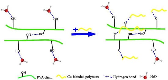 Polymer co-blend modification is conducted by adding a large number of polymers that can generate hydrogen bonds with the hydroxyl groups in PVA so that the hydroxyl groups of PVA and water affinity are reduced for water resistance purposes. Figure 4 shows the polymer co-blend modification.