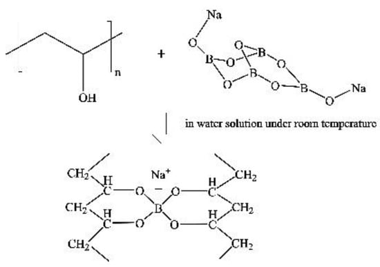 Using the hydroxyl group on the PVA chain and the organic acid or anhydride in high-temperature esterification reactions causes the introduction of carbonyl groups between the molecular chains of PVA [57]. Figure 5 shows the cross-linking reaction between boric acid and PVA [58].