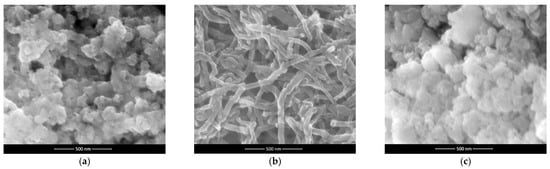 SEM scans of (a) hydrous cerium dioxide, (b) hydrous cerium dioxide—carbon nanotubes, (c) hydrous cerium dioxide—poly(3-octylthiophene-2,5-diyl). SEM experimental parameters—magnitude: 200,000×, detector: Helix, voltage: 18.0 kV, horizontal field width: 1.42 μm.