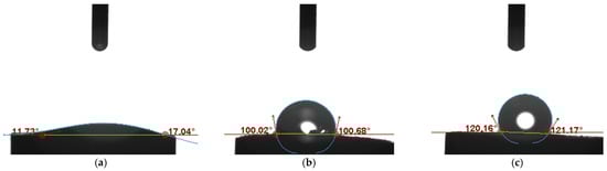 Contact angles of the studied materials: (a) hydrous cerium dioxide, (b) hydrous cerium dioxide—carbon nanotubes, (c) hydrous cerium dioxide—poly(3-octylthiophene-2,5-diyl).