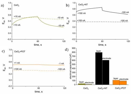 The electrical properties of hydrous cerium dioxide-based materials such as resistance and electrical capacity were examined using the chronopotentiometry method. This electrochemical technique allows one to calculate values of electrical parameters based on the potentiometric response to the set current. During the measurement, the current of 1, 10, or 100 nA (depending on the material properties) is forced to flow through the measuring cell and the potential response is recorded in six steps: for odd numbers of steps, the current has negative sing and for even numbers—positive sign. Electrical parameters are calculated based on the results obtained from each step using the Rtotal = △Edc/2I equation, where △Edc stands for the value of the potential jumps between the odd and even steps and I is the set current value (for calculating the resistance Rtotal value) and C = I(dt/dEdc) equation, where Edc stands for the potential value recorded over time (t) (for calculating the electrical capacitance parameter) [16]. Obtained chronopotentiograms (depicting first two steps) for each of the studied materials are presented in Figure 3 (dash lines). Electrical capacitance was calculated from all six steps for the linear parts of the recorded chronopotentiograms [17].