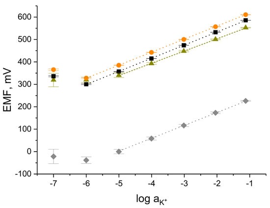 Potentiometric response towards K+ ions for studied electrodes after 24 h of electrodes’ conditioning in 0.01 M KCl (n = 3 items).
