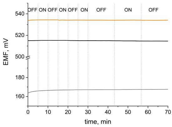 As conducting polymers tend to be susceptible to light exposure [1], the light sensitivity test was performed for designed solid contact electrodes with POT as a component of the composite material (GCD/hCeO2 + POT/K+-ISM) in the presence of the GCD/K+-ISM and GCD/hCeO2 + NTs/K+-ISM electrodes used in this experiment as control groups. The test was performed in the standard solution of 0.01 M K+ ions and the potentiometric response of the electrodes was monitored while changing the light intensity: from very bright room light to complete dark conditions, followed again by light conditions. For the first 30 min of measurement, changes were more frequent and in the second part the exposure time was longer, as can be seen in Figure 6.