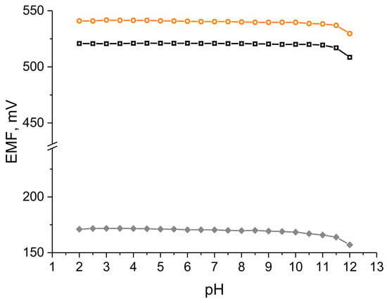 Potentiometric response recorded for GCD/K+-ISM (⧫), GCD/hCeO2 + NTs/K+-ISM (□) and GCD/hCeO2 + POT/K+-ISM (○) electrode during the pH test.