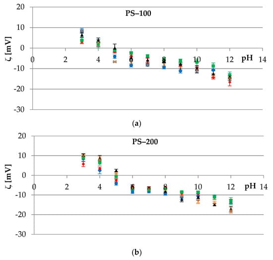The ELS technique was used to provide insight into the possible changes in zeta potential values, due to treating erythrocytes and thrombocytes’ cell membranes with PS-100, PS-200, PS-NH2-100, or PS-NH2-200. In order to obtain the pH-dependent ζ value, the systems, suspended in a 0.155 M NaCl solution, were titrated to the appropriate pH with concentrated NaOH or HCl.