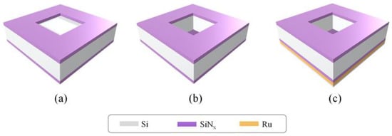 Fabrication of the Ru/SiNx pellicle composite: (a) SiNx film deposition using low-pressure chemical vapor deposition (LPCVD) and backside patterning by reactive ion etching, (b) fabrication of the SiNx free-standing membrane using the Si wet etching process, (c) Ru layer deposition by magnetron sputtering and annealing at 300 and 500 °C using a vacuum furnace.