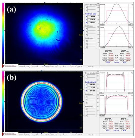 (a) Gaussian and (b) top-hat profile of the 355 nm UV laser measured by a beam profiler.