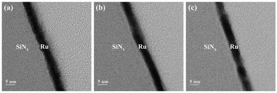 Cross-sectional TEM images of the Ru/SiNx pellicle composites: (a) as deposited, (b) after annealing at 300 °C, and (c) after annealing at 500 °C.