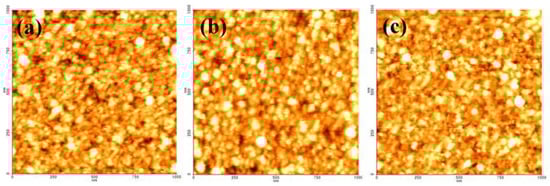 Figure 4 shows the cross-sectional TEM images of the Ru/SiNx composite membranes as deposited and after annealing at 300 and 500 °C. Under each annealing condition, the thickness of the Ru thin film was maintained at approximately 4.1 nm. Figure 5 presents the surface roughness of the Ru film as a function of annealing temperature, and the root-mean-square values of the surface roughness were 0.775, 0.805, and 0.709 nm, respectively. The thickness and surface roughness are factors that affect the surface scattering of the thin metal film according to Equation (5) [26,27]. In this study, the effect of surface scattering on the change in resistivity was excluded because the corresponding factor was constant at varying annealing temperatures.