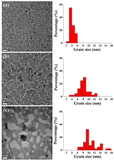 Figure 6 shows the calculated average grain size of the Ru films after annealing treatment. The average grain size increased from 4.0 to 8.1 and 10.6 nm owing to the grain growth due to annealing at 300 and 500 °C, respectively. According to Equation (5), the grain boundary scattering is inversely proportional to the grain size [26,27]. Therefore, the resistivity of the Ru film was expected to decrease as the annealing temperature increased.