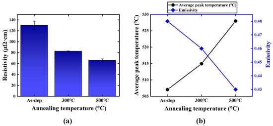 Therefore, complex permittivity is related to plasma frequency () and electron scattering time () using the Drude model, as shown in Equation (3). Plasma frequency is unique for each material, and electron scattering time can be derived as shown in Equation (4). Here, is the resistivity of the film, is the electron charge, is the electron concentration, and is the electron mass. From this equation, the inverse relationship between electron scattering time and resistivity can be confirmed. In addition, the change in resistivity is expected to directly affect electron scattering time and subsequently emissivity [22,23].