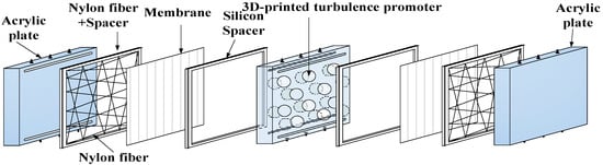 The fabrication scheme and the schematic detailed configuration of a double-unit flat-plate membrane contactor module for CO2 absorption by MEA absorbent are illustrated in Figure 1 and Figure 2, respectively.