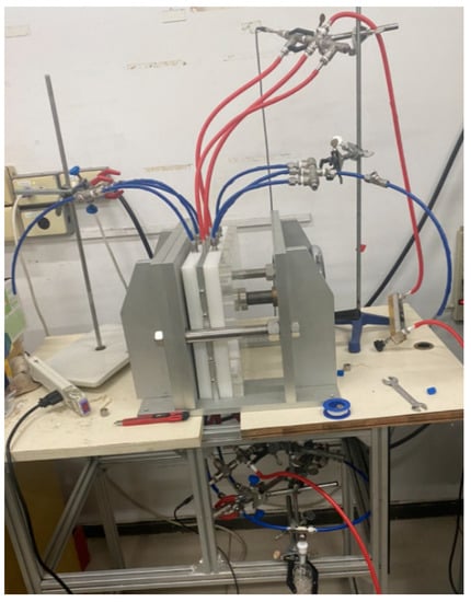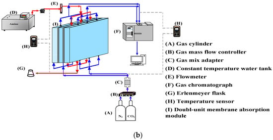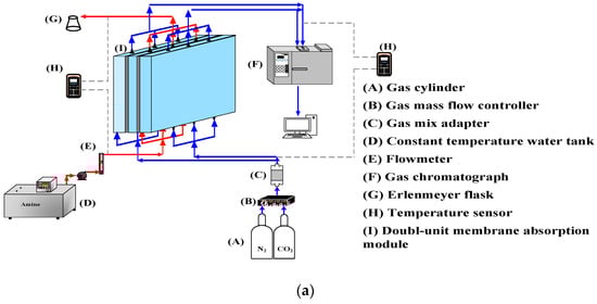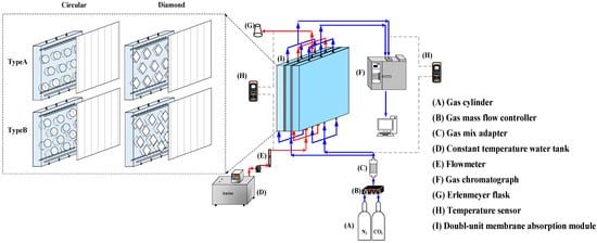 A photo of the operating experimental apparatus is shown in Figure 3, with acrylic plates used as outside walls screwed tightly by two parallel stainless-steel plates. The double-unit flat-plate membrane contactor module contains two flow channels with 3D turbulence promoters embedded onto the MEA feed stream and another empty channel for the CO2/N2 gas mixture. Two parallel-plate flow channels (L = 0.21 m, W = 0.29 m, H = 1 mm) separated by a hydrophobic composite membrane made of PTFE/PP (polytetrafluoroethylene/polypropylene) as the permeating medium with a nominal pore size of 0.1, a porosity of 0.72, and a thickness of 130 µm (ADVANTEC) were used in the experimental work. The membrane surface in the empty channel was wound with 0.2 mm nylon fiber as a supporting material to prevent vibration.