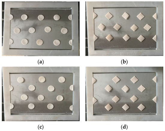 Top view of two shapes and two configurations of 3D turbulence promoters. (a) Circle shape (Type A), (b) Square shape (Type A), (c) Circle shape (Type B), (d) Square shape (Type B).