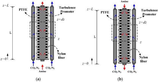 CO2 capture techniques [] to remove CO2 from gas mixtures for industrial processes have been widely studied over the past decade, including conventional contactors with chemical absorbents. Membrane contactors involve the combined techniques of conventional gas absorption and membrane separation, and they can effectively overcome the problems associated with conventional contactors because of the presence of a membrane []. Several technologies, namely absorption [], adsorption [], and membrane processes [], are the processes capable of CO2 absorption, for which the membrane contactor is a promising technology with high absorption efficiency. The membrane contactor offers the advantages of low energy consumption, a large and stable gas-liquid contact area, continuous operations, high modularity, and flexibility scale-up []. The configuration of the membrane contactor in which the hydrophobic porous membrane is employed acts as a barrier separating CO2 gas feed and absorbent streams, and the gas/liquid interface is formed at the membrane pore mouth in the gas feed stream because of the non-wetted hydrophobic porous membrane. Currently, chemical absorption by amine solution is the most advanced technology for absorbing CO2 from gas mixtures, as confirmed by a previous study [], and alkanolamine-based CO2 absorption processes have been used commercially. Faiz and Al-Marzouqi [] developed a mathematical model for CO2 absorption using monoethanolamine (MEA) as an absorbent from natural gas at high pressures, and successful process intensifications for CO2 absorption processes have been investigated that employ selective membrane materials []. Moreover, the membrane absorption efficiency dependent on the distribution coefficient was determined with lower membrane wettability [] and the properties of absorbents []. CO2 is transported from the gas side across the boundary layer and membrane to the absorbent side, and thus both chemical absorption and separation occur simultaneously according to the diffusion–reaction model [,]. Theoretical studies of the dusty gas model [], including Knudsen–molecular diffusion, were developed to comprehensively understand the mass transfer behavior of CO2 absorption [] using amines [] and analyzing the CO2 absorption efficiency.