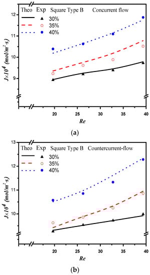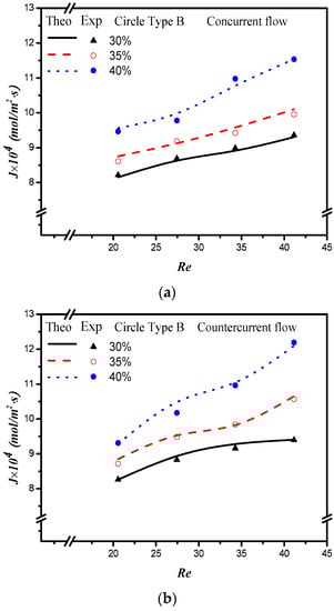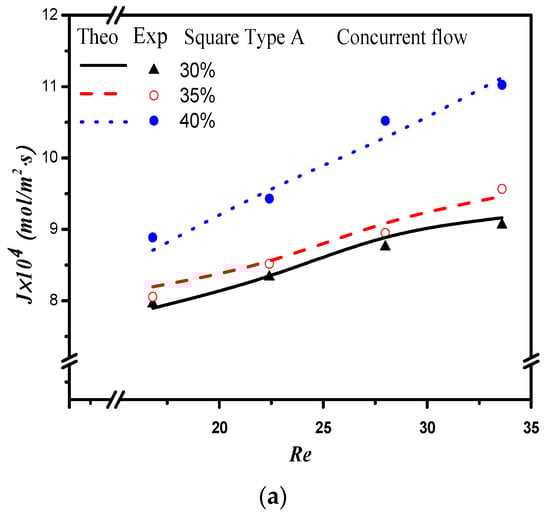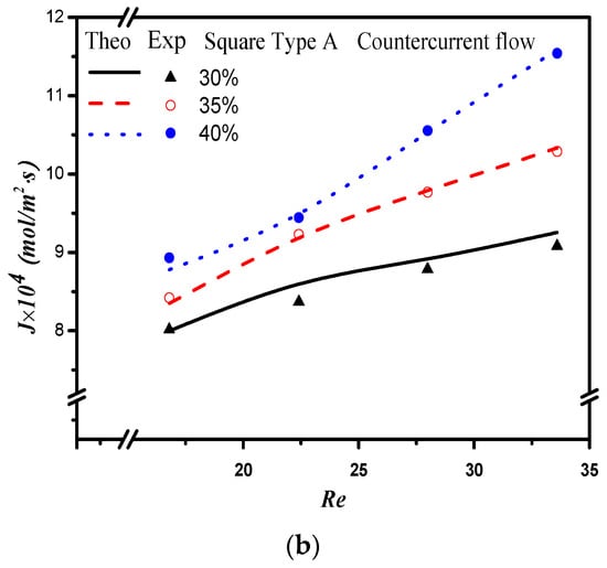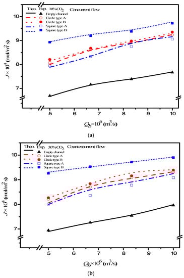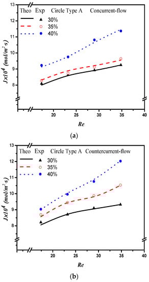 where , and are the absorption flux improvement for countercurrent-flow operations with empty channel and concurrent and countercurrent flow operations with embedded 3D turbulence promoters, respectively. Meanwhile, the subscripts P and empty denote the MEA flow channels with/without embedded 3D turbulence promoters, respectively, and the superscripts CN and CT denote concurrent and countercurrent flow operations, respectively. The percentage increase in absorption flux improvement was evaluated in the comparisons of the absorption flux in the module with the embedded 3D turbulence promoter to that of the empty channel, as seen in Figure 16 for both the Circle and Square turbulence promoters under two flow patterns, respectively. The theoretical predictions show that an absorption flux improvement of up to 40% was obtained with embedded Square turbulence promoters of Type B array patterns compared with that in the empty channel device, as seen in Figure 16.