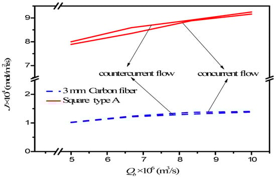 The CO2 absorption flux for various MEA feed flow rates, inlet feed CO2 concentrations, and turbulence promoter configurations were obtained using numerical Runge–Kutta marching scheme with Equations (7) and (8a) and Equations (7) and (8b) for concurrent and countercurrent flow operations, respectively, and hence, comparisons were made on device performance for both empty and promoter modules, as indicated in Figure 10.