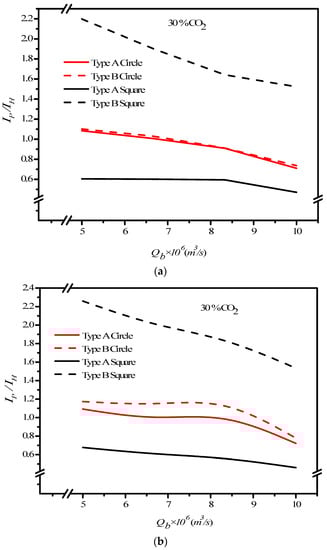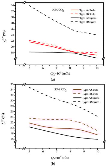We also found that the helpfulness of embedding turbulence promoters with Type B array pattern was higher than that of Type A array pattern under both flow operations. Meanwhile, the increase in the MEA feed flow rate yielded a lower ratio of and reached a steep decrease for the higher MEA feed flow rate, being larger than m3/s. The order of the ratio of is expected to have the same trend of the absorption fluxes, as follows: Square Type B Circle Type B Circle Type A Square Type A.