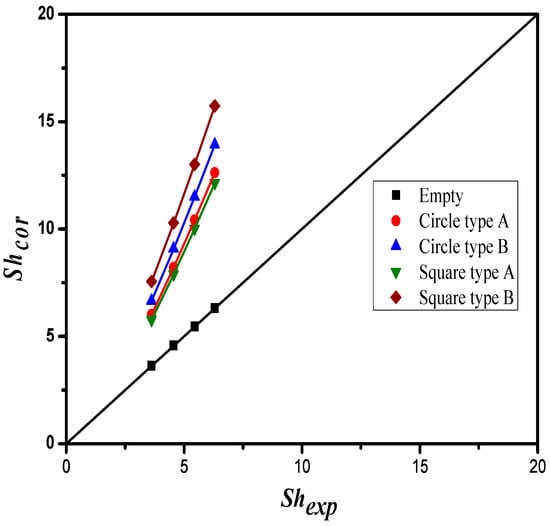 The normal equations for the least square parameters were set up to find the fitting function in a linear model, for which the regression line was determined to be linear and hence easily solved. The correlated Sherwood numbers, as shown in Figure 17, indicate that the mass transfer coefficient of the device with embedded Square turbulence promoters in the Type B array pattern achieved a higher value than those of the devices with Square Type A as well as with embedded Circle turbulence promoters. Embedding turbulence promoters played an important role in the absorption flux improvement because of the disruption of the concentration boundary layer with mass-transfer resistance reduction, and thus the CO2 absorption flux was enhanced because a higher turbulence intensity was induced. In other words, the non-smooth curvature geometric shape of Square turbulence promoters embedded in flow channels created higher turbulence vortices and resulted in a larger absorption flux.