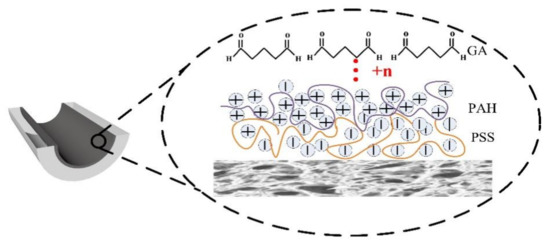 The dried hollow fibers were sealed into plastic membrane modules with an effective length of 25 cm. LBL deposition at the inner surface of the substrate was performed by introducing the polyelectrolyte solution throughout the fiber lumen with a syringe and maintained for 5 min. Polyanion PSS and polycation PAH solutions were applied alternately to achieve the desired number of layers with a 5 min DI water rinse in between. GA crosslinking was conducted afterwards in a similar fashion, if applicable. The schematic drawing of the deposition process is shown in Figure 1. The membrane modules were then stored in DI water for NF performance tests.