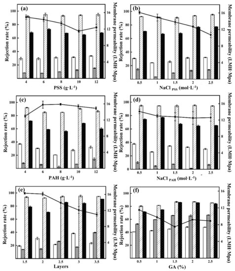 Effects of variables (a): PSS; (b): NaClPSS; (c): PAH; (d): NaClPAH; (e): layers; (f): GA on the performance of LBL NF membranes. (Membrane permeability