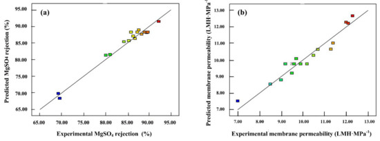 Predicted MgSO4 rejection rate (a) and membrane permeability (b) versus their corresponding experimental measurements.