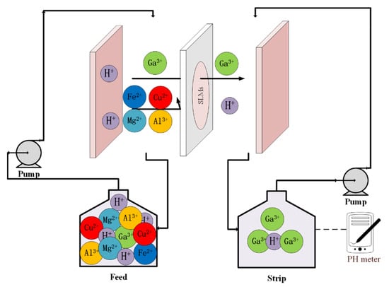 Both feed and stripping solutions were circulated by peristaltic pumps (Baoding Qili Precision Pump Corp., Ltd., BT600-01, Baoding, China) and kept at a flow rate at 75 mL/min at 300.65 K to avoid concentration-polarization conditions at the interfaces of the membrane and the aqueous solutions. Samples (0.5 mL) of the feed and stripping solutions were periodically taken to analyze the Ga(III) concentration. The extraction percentage (E%) was determined as follows: