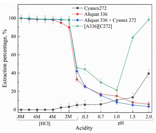 In the solvent-extraction process, the acidity of the feed solution is an important variable for the extraction performance of Ga(III) using Bif-ILs. Therefore, the initial acidity of the feed solution was varied with a wide acidity range (Low acidity: pH range from 0.3 to 2.0; High acidity: 1 M to 8 M HCl) to determine and compare their performance in the extraction of Ga(III) using the acidic extractants, Aliquat 336, binary mixtures and Bif-ILs. The experimental results, shown in Figure 2, show that the extraction percentage of Ga(III) with the different acidic extractants was maintained at a low level at relatively high-acidity conditions. In low-acidity conditions, Ga(III) extraction continuously increased with the increase in the solution pH. Among the three acidic extractants, the extraction percentage of Ga(III) increased with acidity of these extractants, i.e., Cyanex 272 < PC88A < D2EHPA [28]. As illustrated in this figure, the Ga(III)-extraction percentage reached nearly 100% with Aliquat 336, binary mixtures and Bif-ILs at high-acidity conditions, while the extraction percentage decreased with decreasing acidity. For instance, an almost quantitative extraction of Ga(III) at HCl range from 4 M to 8 M HCl decreased sharply to 33.0% and 19.2% when using Aliquat 336 and Aliquat 336 + D2EHPA (pH = 1.0), respectively, and continuously decreased to 6.0% and 2.8%, respectively, at pH 2.0. When mixing acidic extractants with Aliquat 336, an antagonism phenomenon occurred for Ga(III) extraction, indicating the number of functional groups reduced in these systems. Interestingly, the extraction percentage of Ga(III) using Bif-ILs decreased gradually with increasing acidity from pH 2 to pH 1, reached the minimum at pH 1 (0.1M HCl) and then increased again with an increase in HCl concentration from 0.1 M to 8 M. Although the extraction percentage varied with the change in acidity, at each component, Bif-ILs showed better extraction capability than both the individual extractants and binary mixtures. The enhancement of EX% indicates there is a obviously synergistic effect between components in Bif-ILs at both high- and low-acidity conditions, while different extraction mechanisms occur. Both cation exchange and anion exchange mechanisms are involved in the extraction process with aqueous solutions of different acidities, and the Bif-ILs can effectively coordinate with Ga(III) to form a stable extraction complex. Therefore, Ga(III) extraction using Bif-IL in both high- and low-acidity conditions was discussed in detail, and the possible mechanisms were proposed.