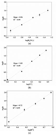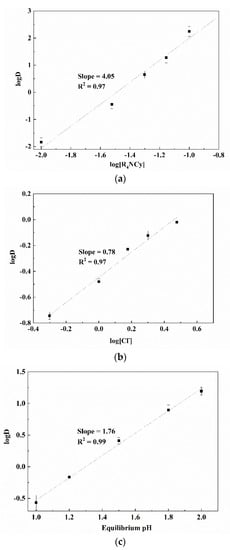The linear relationships between logD versus log[R4NCy], log[Cl−] and equilibrium pH at a low-acid concentration range were obtained with slopes of 4.05, 0.78, and 1.76, respectively (Figure 4). The slope values reveal that the stoichiometries of [R4NCy]org, [Cl−]aq and [H+]aq were approximately 4, 1 and 2, respectively.