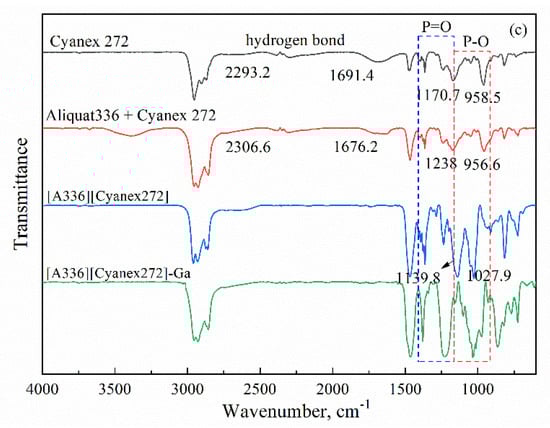 FT-IR spectra of acidic extractants, Aliquat 336, binary mixtures, Bif-ILs and Ga(III)-loaded Bif-ILs. (a) D2EHPA based system, (b) PC 88A based system, (c) Cyanex 272 based system.