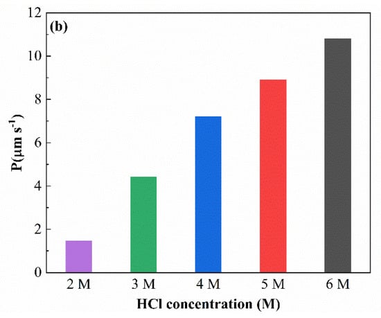 It is widely accepted that the acidity levels of both feed and stripping solutions are of great influence in facilitated transport processes using supported liquid membranes [31]. The influence of the initial HCl concentration in the feed solution on the transport of Ga(III) with an SLM containing [R4NCy] was assessed, and results are shown in Figure 6. The results show that the extraction percentage elevated sharply from 51.2% to 95.8% as the HCl concentration increased from 2 to 4 M, while the extraction percentage increased smoothly from 98.5% to 99.7% as the HCl concentration increased from 4 to 6 M. Similarly, the permeability coefficient increased from 1.47 to 7.20 μm s−1 and from 7.20 to 10.8 μm s−1, as the HCl concentration increased. This means that the transport of Ga(III) was accomplished by the interaction between the Bif-ILs and the anionic complex GaCl4− formed in high hydrochloride acid solutions at the membrane/feed interface.