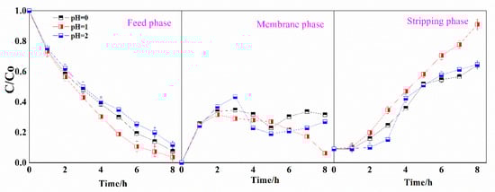 The properties of the stripping solution play an important role in both the transport and selectivity in SLM processes. Different pH values ranging between 0 and 2 were examined for their effects on the transport efficiency of Ga(III) through the R4NCy-based SLM. As shown in Figure 8, Ga(III) concentration gradually decreased in the feed solution and increased in the stripping solution. Concentrations of 92.4%, 96.2% and 88.2% of Ga(III) in the feed solution could be transported to the stripping solution through SLM with stripping-solution acidity values of pH 0, 1 and 2, respectively. The performance of pH 1 solution as the stripping solution was more efficient compared with that of other stripping solutions of higher or lower pH value. This was coincident with the lowest extractability obtained by Bif-ILs in the solvent extraction process, which indicates that the low interaction between Ga(III) and Bif-ILs in the strip-SLM interface felicitated the transport of Ga(III). The GaCl4− complexes were extracted by the Bif-ILs at the feed/SLM interface and then stripped at the SLM/strip phases interface in a continuous process. During the transport, some of the Ga(III) ions were retained in the membrane phase and transported slowly into the stripping solution. It seems that the transport of Ga(III) across the SLM occurred in a diffusion mechanism as the Ga(III) concentration changed in the membrane phase (Figure 8). Furthermore, Ga(III) transport is governed by mass transfer in the membrane, rather than by chemical reactions between Ga(III) species and carrier in the SLM [20].
