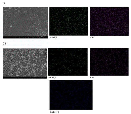 SEM micrographs of SLM containing Bif-IL(R4NCy) before and after the transport experiment are displayed in Figure 9. The appearance of P and N belonging to R4NCy confirmed that the Bif-IL successfully existed in the membrane and was evenly distributed. The SLM after the experiment showed elevated amounts of Ga(III) loaded on the membrane as a complex with R4NCy. Meanwhile, it can be seen from Figure 9 that the quantities of P and N were significantly reduced, which means a small amount of ionic liquid was lost from the membrane pore after the experiment.