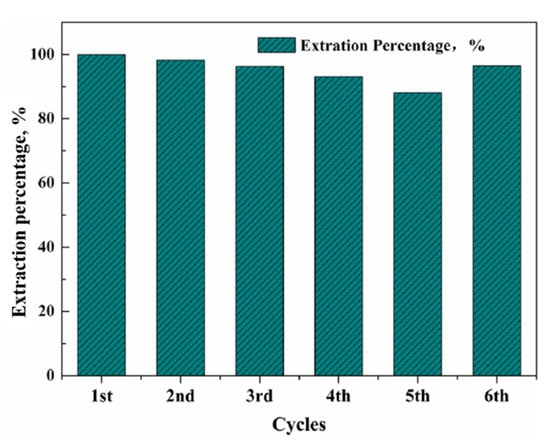 Although the SLMs performed effectively in metal ion transport, they suffered from lack of stability over time, due to the gradual loss of the carrier in the surrounding aqueous phases, which could affect the permeability and selectivity of SLMs [20,32]. The employment of ionic liquids as carriers is one of the advanced approaches to minimize the instability problem, due to their low stability in aqueous solutions and greater capillary force associated with their high viscosity, which can reduce the leakage of carriers from the pores of supporting membranes [33,34]. To evaluate the stability of the SLM containing R4NCy in Ga(III) transport, five successive transport experiments were carried out using the same piece of SLM under optimum conditions, while the membrane was impregnated with fresh carrier at the sixth cycle. Only a slight decrease in the extraction percentage was observed in Figure 10. The corresponding extraction percentage for the five repeated runs was as follows: 99.6%, 98.2%, 95.9%, 92.8% and 88.1%. Although the acidity of the feed solution is very high, it seems that the employed membrane possessed great multiple-use potential. Figure 10 also shows Ga(III) extraction increased to 96.4% after impregnation again at the sixth cycle. The results indicated that the prepared membrane showed satisfactory potential for long-term operation, and could be regenerated again after impregnation.
