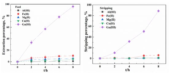 Ga(III) has always co-existed with various kinds of metal ions, depending on the resources of the aqueous solutions, and metal transport in multi-component systems is complicated, due to the diversity of metal ions [31]. Therefore, selectivity behavior of SLM were investigated using synthetic mixed solutions containing Ga(III) in the presence of Al(III), Mg(II), Cu(II), Fe(II) and Fe(III) using R4NCy in both SX and SLM processes at optimum conditions. In the SX process, nil extraction of Al(III), Mg(II), Cu(II), Fe(II) (EX%: 3.1%, 0.3%, 3.2%, 0.8%) was found when the Ga(III) extraction percentage was 99.4%. As shown in Figure 11, the SLM system provided preferential transport of Ga(III) in comparison to the other four accompanying metals, with Ga(III) reaching extraction and stripping percentages of 96.1% and 88.5%, respectively. It was also found that although some metal ions could be extracted into the membrane, negligible Al(III), Mg(II) and Cu(II) were transported into the stripping solution, whilst around 6% Fe(II) was transported.