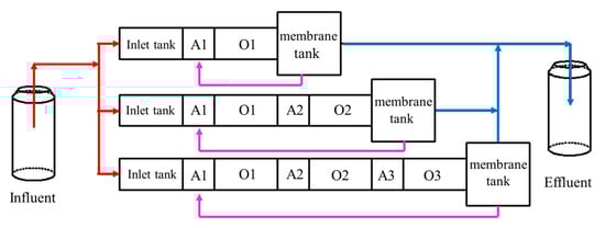 The above studies have effectively improved the nitrogen and phosphorus removal efficiency of the MBR system in several cases, but they are not able to cope competently with the fluctuating wastewater composition. Zheng et al. found that the multi-stage A/O process can increase the diversity of microorganisms in the system to improve the impact resistance of the system effectively []. Wang et al. found that the multi-stage A/O process can improve the nitrogen removal ability under low carbon sources []. Considering the advantages and disadvantages of the above works, this research integrates the Multi-stage A/O process and the MBR process to design an overflow multi-stage A/O-MBR processes. Alternating A/O operations with various stages are combined with ultrafiltration membranes for enhanced stability and a higher removal of pollutants, such as nitrogen and phosphorus.