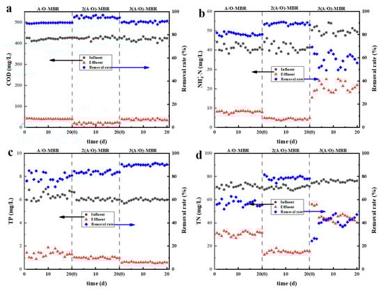 As shown in Figure 2a, the COD values of the permeate from the A/O-MBR, 2(A/O)-MB and 3(A/O)-MBR process are 40.87 mg/L, 20.02 mg/L and 37.78 mg/L, and the average removal rates are 90.29%, 95.29% and 90.99%, respectively, all complying with the Sewage Disposal Standard Class 1A.