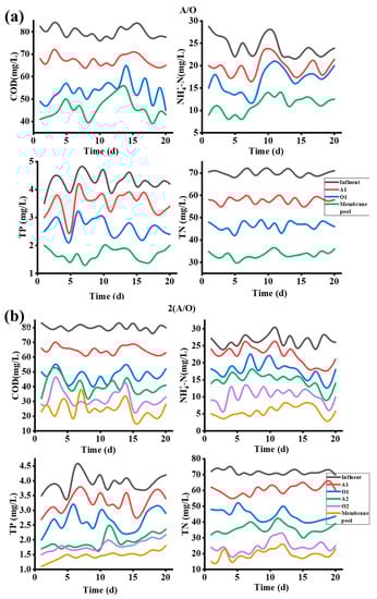 Figure 2 shows the overall removal rate of COD, NH-N, TP, and TN by the three processes, and Figure 3 shows the variation of pollutant concentrations in individual tanks for each process. In general, all three processes demonstrate the high removal effect of the four pollution indicators, suggesting the feasibility of the combination of AO and membranes processes. The comparation of the specific removal performance of the three processes are discussed as follows.