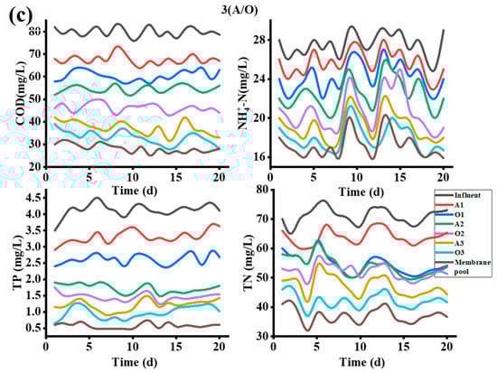 Treatment effect of overflow O-MAO-MBR on sewage (a) A/O-MBR change, (b) 2(A/O)-MBR changes, and (c) 3(A/O)-MBR changes.
