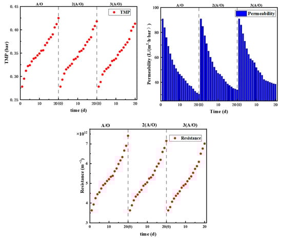 The test period of each process is 20 d. As the same membrane module is used for the three types of setups, the initial permeabilities and TMP of all three processes are normalized according to that of A/O-MBR. The corresponding results of the three processes are shown in Figure 4. The trends in TMP are similar; the gradient of the TMP curves follows a decreasing then increasing path. Similarly, the trends in permeability follow the same trend too. However, in terms of the absolute values, the final TMP of the A/O-MBR process at the end of experiment is the largest and the corresponding permeability is the lowest among the three processes, while the 3(A/O)-MBR process demonstrates the smallest TMP and the highest permeability. The result suggests that membrane fouling decreases with increasing the number of A/O stages. Studies [,] have shown that a high organic load aggravates the membrane fouling in a MBR process, and reducing the organic load can effectively alleviate membrane fouling. Among the three processes, the effective total working volume of the reactor increases as the number of A/O stages increases, such that the organic load of the system deceases, which could be the main reason for the slightly lower fouling propensity.