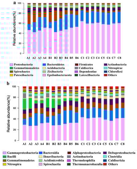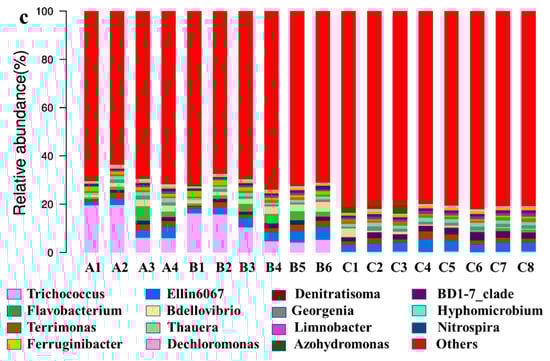 Figure 6a is the microbial community structure column diagram of the sludge samples at the phylum level from the three processes. The samples are numbered according to Table 2. The top 15 species of microbial abundance in the sludge in all reaction tanks of the 3 processes are the same. Proteobacteria, Bacteroidetes, Firmicutes and Actinobacteria account for a total of about 90%, with individual average values of 53.06%, 22.22%, 9.64% and 6.30%, respectively. The above data indicates that the Proteobacteria and Bacteroides are the dominant flora in the reactor, consistent with the study of Tang et al. [,].