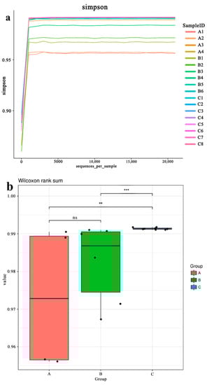 Table 3 presents the statistical data of the alpha diversity index. Figure 7a is the Simpson dilution curve. It shows that when the number of sampled sequences increases, the Simpson number reaches the maximum value quickly. This result indicates that the sampling meets the sequencing depth and that the sample sequencing amount is reasonable and has covered all groups.