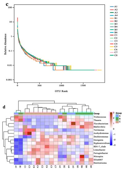 Figure 7b shows the relationship among the differences in microbial diversity in groups A, B, and C, where SDA > SDB > SDC. That is, as the number of A/O stage increases, the difference in microbial diversity in each reaction tank in the three processes gradually reduces. Additionally, from the middle line of the box plot, it can be seen that the diversity index gradually becomes larger with more A/O stages, that is, SA < SB < SC. The microbiological difference between group A and group B was not significant, but group C was significantly different from group A and group B. It indicated that the increase in A/O series is helpful to increase the microbial abundance in the reaction tanks, but it reduces the diversity difference among the reaction tanks in the process as well. This fact could be related to the impact load and residence time of the reactor. The relationship between impact load (indicated by P) and residence time (indicated by H) among the three groups is PA > PB > PC, HA < HB < HC, which is closely correlated to the relationship between the microbial diversity, i.e., a lower P and higher H corresponds to a larger S.