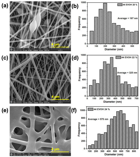 SEM images and fiber diameter of 44EVOH at different polymer concentrations: (a,b) 20 wt%, (c,d) 22 wt%, and (e,f) 24 wt%.
