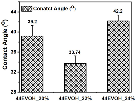On the other hand, the fiber diameter distribution demonstrated a direct relation with polymer concentration, such as when an increase in the concentration resulted in increased nanofiber diameter. This happened because of the increase in the viscosity of the polymer solution and an increase in the extent of polymer chains in the solution [44]. The water contact angle of the fabricated membranes confirmed the hydrophilic nature of 44EVOH and with the increase in the polymer concentration, there was a relative decrease in the contact angle due to the high fiber diameter and pore size. Figure 4 shows that 44EVOH_22% exhibited a lower contact angle (33.74°) than 44EVOH_20% and 44EVOH_24%. The 44EVOH_24% contact angle (42.2°) indicated a different story and this is because, at higher concentrations, the fibers melt and form a film. Thus, although the fiber diameter increases with the polymer concentration, the film formation and non-uniformity significantly influence the surface wettability. These results are consistent with those in the literature except that the water contact angle at a higher concentration was slightly higher due to its morphology. Thus, 44EVOH_22% was chosen as the optimum polymer concentration for further experiments due to its perfect morphology and hydrophilicity.