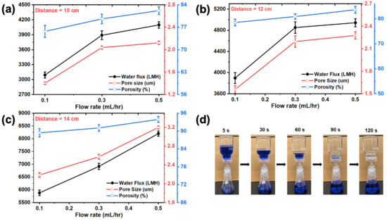 27EVOH_22% ENM properties at different flow rates and distances between the collector and needle: (a) 10 cm, (b) 12 cm, and (c) 14 cm. (d) Visuals of the separation process completed in 120 s.
