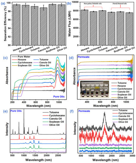 Separation performance of the optimized 27EVOH_22% ENMs for different oil–water mixtures: (a) Separation efficiency, (b) Water flux and UV–visible spectra of pure oils and permeate, (c) Pure oils, (d) Permeates. Raman spectroscopy spectra for pure oils and permeates, (e) Pure oils, and (f) Permeates to confirm separation efficiency >99.9%.