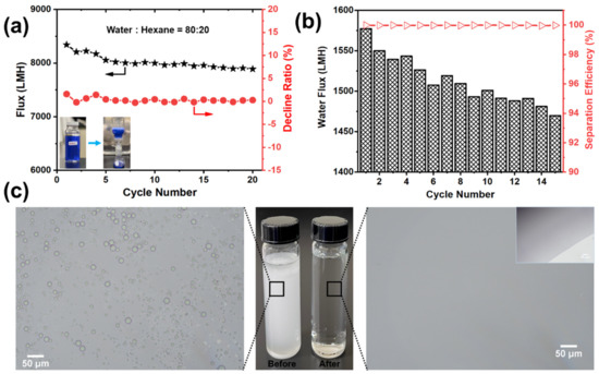 To test the flux recovery of the optimized membrane, a water–hexane two-phase system was employed, and 20 cycles were completed as shown in Figure 9a. After each cycle, the membrane was washed thoroughly using ethanol and DI water to recover the flux. It was observed that there was no sharp decline in water flux with each cycle but there was a gradual decrease. After the last (20th) cycle, the flux value was 7867.21 L m−2 h−1, which is still a high flux level. Rates of decline were measured for each cycle, and the overall decline rate for all 20 cycles was less than 2%. This shows that optimized EVOH membranes exhibit exceptional antifouling performance and also proves the long-term stability and viability for practical application of the membrane. This is due to the hydrophilic nature of EVOH, usually with enhanced hydrophilicity of the membrane surface that increased the resistance to membrane fouling because many foulants are hydrophobic in nature.