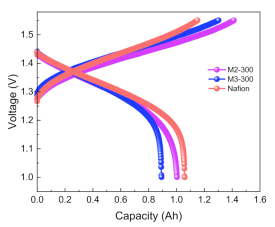 The charge–discharge curves of VFBs with M2-300, M3-300, and Nafion membranes.